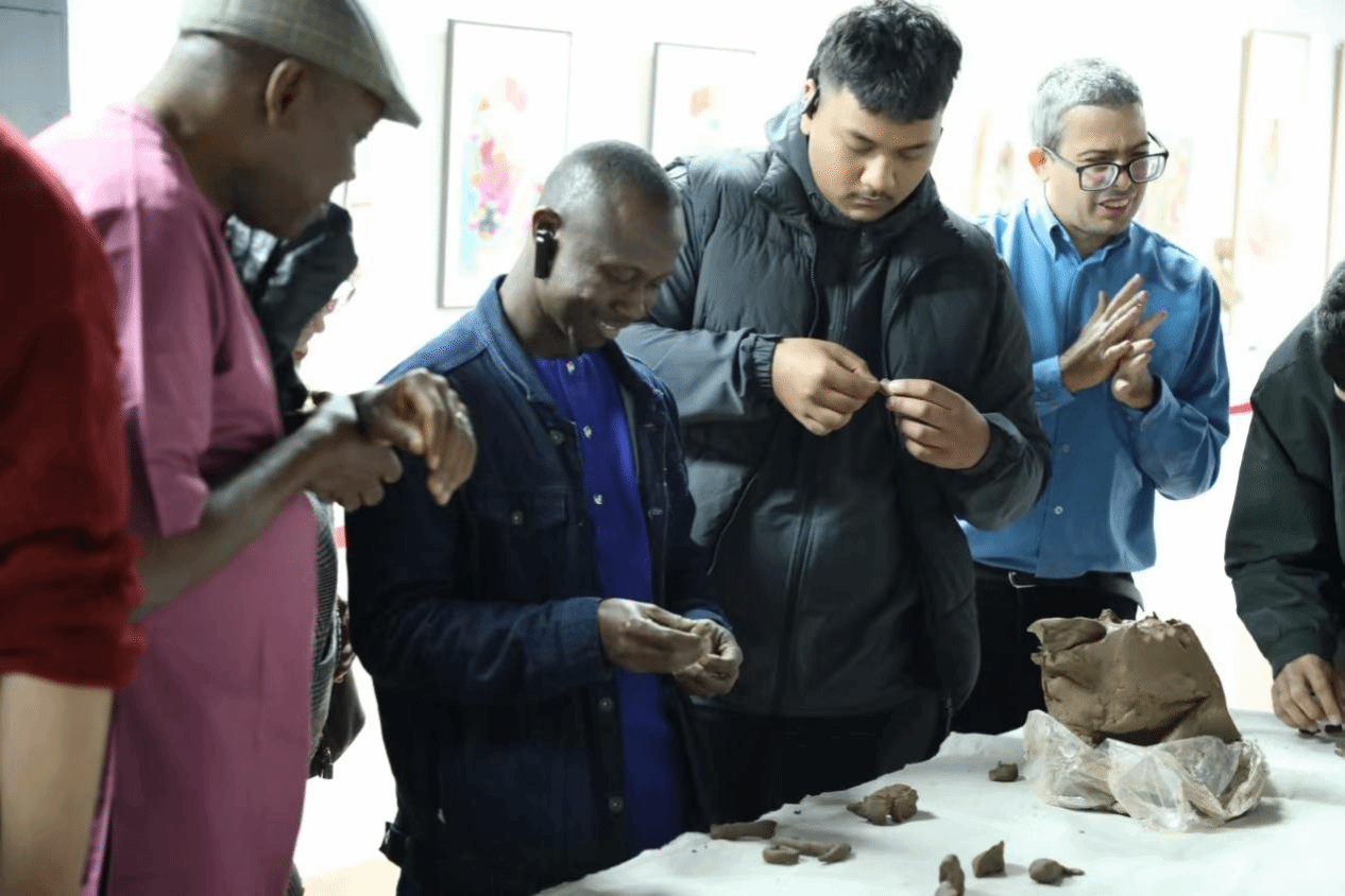 向留学生们介绍中国非遗文化的相关知识和蕴藏的民间故事。正值”best365唯一官方网站非遗研培教学成果汇报暨京津冀非遗名家邀请展”展出之际,best365官网艺术创作研究中心匡丽萍老师为留学生们进行了导览,对中国非物质文化遗产做了初步的介绍,对天津的非遗文化代表“杨柳青年画”、“泥人张”雕塑的起源、发展以及其所蕴含的老百姓对美好生活的寄予和希望进行了生动有趣的讲述。留学生们积极参与,热情高涨。观展后,天津泥人张彩塑工作市高级工艺美术师赵阳老师为留学生进行现场泥塑创作演示,详细介绍了泥人张如何塑型、上色的技巧和工艺。学生们听完跃跃欲试,按照老师的讲解,发挥各自的创造力,创作出各具民族特色的作品。留学生通过创作进一步体验了泥人张非遗技艺的基本知识和技巧,通过与老师的互动和交流,对中国民间艺术有了更深入的了解和认识。