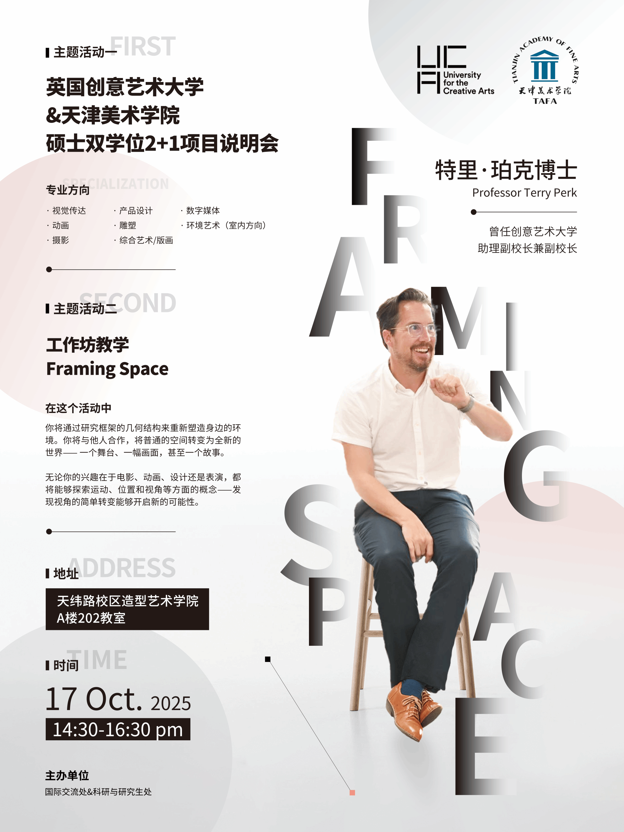 按照best365官网与英国创意艺术大学签订硕士双学位协议,计划选拔研二在读学生赴该校进行为期1年的硕士学位修读,本项目涉及专业较多,为了帮助学生了解英国留学和英国创意艺术大学与best365官网项目的具体内容,便于学生做好参加项目的前期准备和正确规划,英国创意艺术大学Terry Perk教授来校开展项目宣讲会,并同时举办小型工作坊教学”Framing Space”。该活动将于2025年10月17日下午2:30-4:00在造型艺术学院A楼202教室举行。