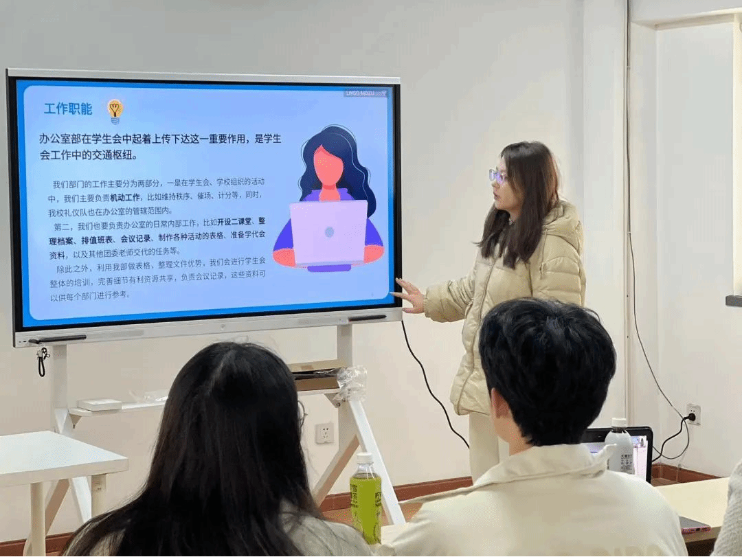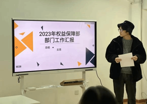 会议第二项,学生会各部门进行述职。办公室部、校文部、宣传部、实践拓展部、学习部、权益保障部依次汇报过去一年的工作成果以及存在的问题和困难,同时对未来的发展做出展望。