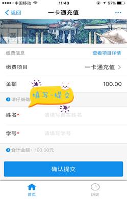 6、填写“姓名、学号”确认提交。可查看右下角历史记录,显示缴费情况。